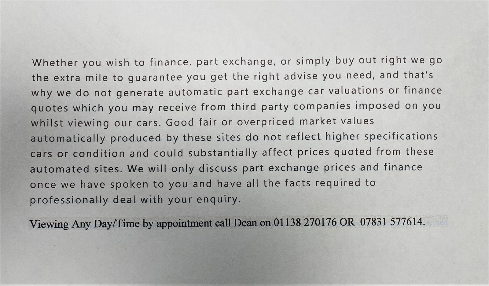 We do not operate an organised distance sales scheme. We have only agreed to sell and deliver the car to you without you viewing the car first as an exception to the company policy in view of the [the fact that you live too far away or are unable to drive the distance or take the time off work.