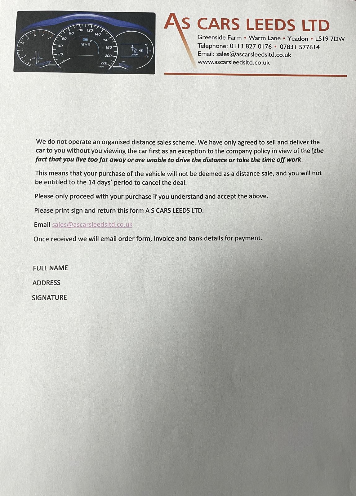 This means that your purchase of the vehicle will not be deemed as a distance sale, and you will not be entitled to the 14 days’ period to cancel the deal.
