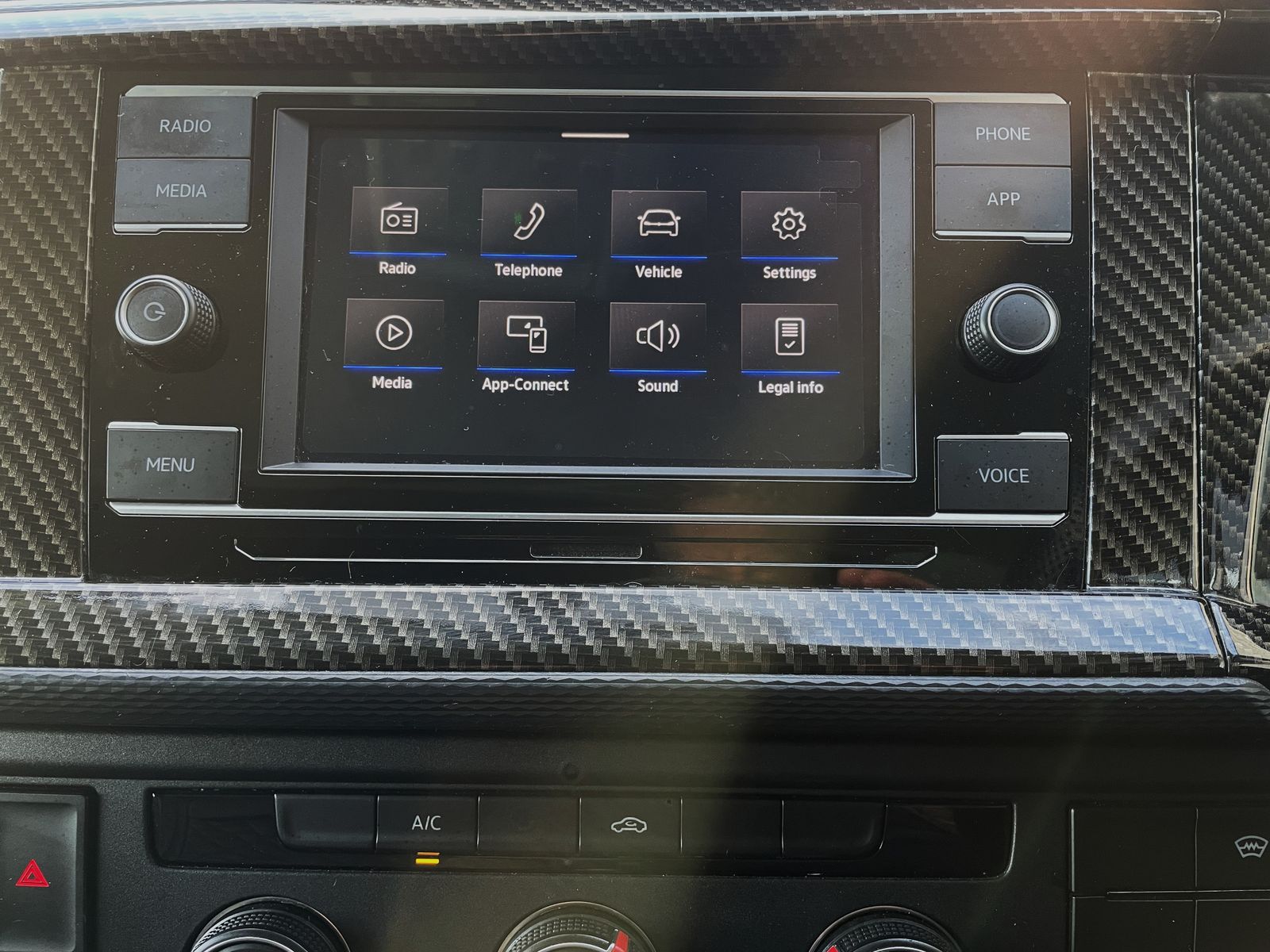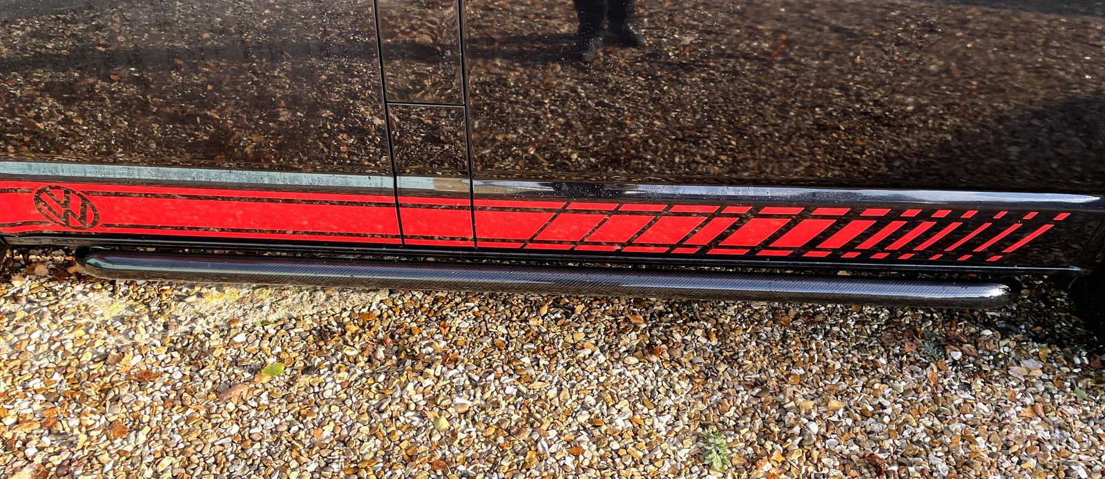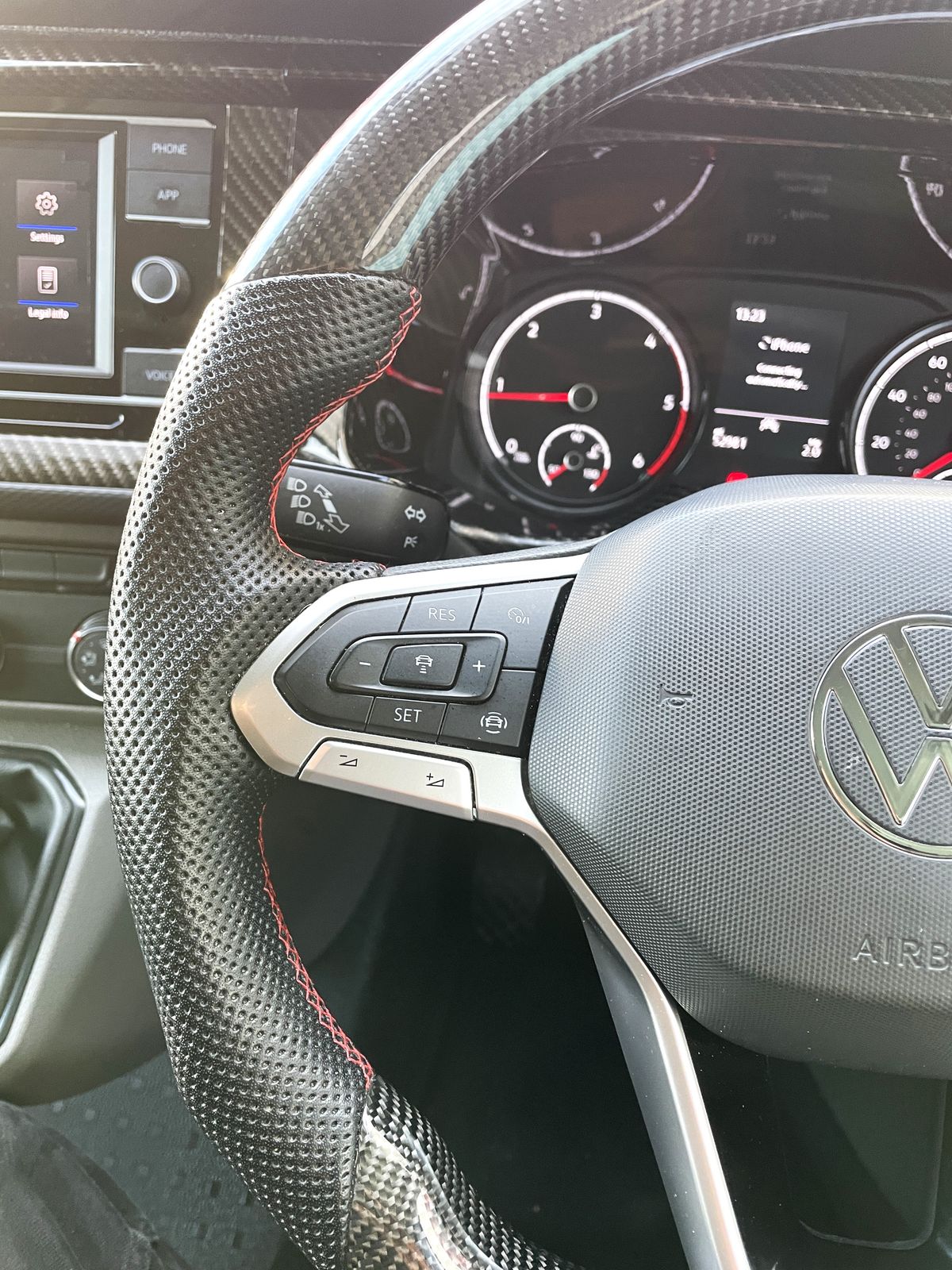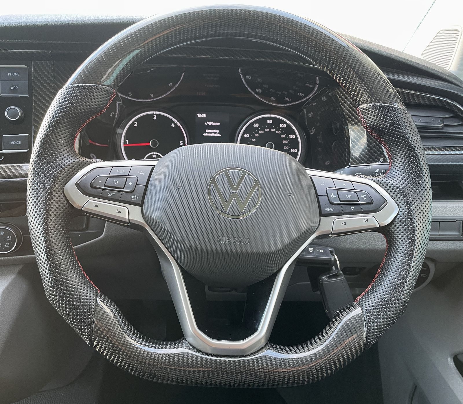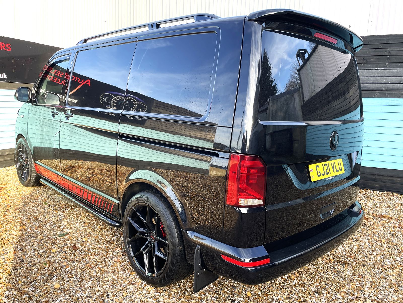 Volkswagen Transporter T6.1 T30 Highline, 2.0 TDI, 6 speed manual, diesel, 150ps, FWD, Euro 6, Demo plus one meticulous owner in Black mettalic, immaculate condition inside and out, with over £10k of Leighton and carbon conversion upgrades to include 3 front Leighton full leather seats, lowered suspension by 40mm with 20" Leighton alloys with red calipers on premium matching tyres with locking wheel key, tailgate upgrade, Leighton front end with carbon splitters, side steps carbon dipped, interior dash surround and door handles carbon, carbon mirror backs, carbon badges and cup holders, side indicator repeater surrounds in carbon, carbon rear bumper protector, carbon front bonet protector, Leighton font carpet mats in grey, the rear is fully carpeted. air conditioning, comfort pack, Leighton leather and carbon multifunction steering wheel with cruise control, on board computer, and voice recognition blue tooth hands free phone system, tinted side windows with tinted wind deflectors, rear mud flaps, ABS, Anti skid regulation, brake assist, electric diff lock, forward collision monitor, hill start assist, Auto head lamp activation, front fogs with active cornering, electric windows and electric heated power folding mirrors, heated front screen, DAB radio usb Apple car play via apps, front and rear park distance with park assist, The top part of the bulk head has been removed but is in the vehicle should you require it re fitting. Full Volkswagen service history and mot to march 2026 with no advisories as the previous advisory dust cover has been replaced.